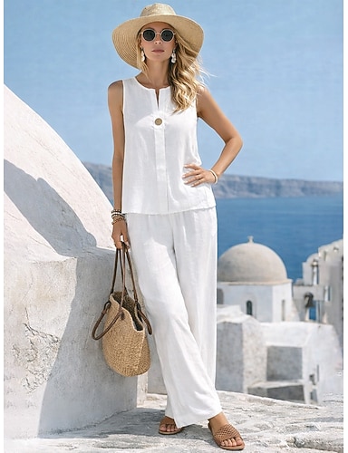 Dámské Sady kalhot Imitace bavlny a lnu Bez rukávů Tričkový Pevná barva Módní Šik ven Ležérní Denní Venkovní Vodní modrá Černá Bílá Léto Běžný