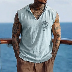 Pánské palmy tropické boho pobřežní bezrukávové vesta s kapucí tílko s potiskem bavlna len roztřepený surový lem volný střih plážové letní dovolená plavby značkové oblečení velikosti S M L XL XXL XXXL