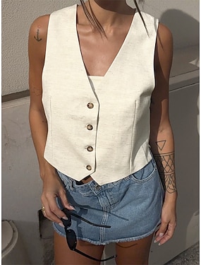 Dámské Bavlněná lněná vesta Halenka Slátanina Knoflíky Bez vzoru stylové Moderní Na běžné nošení Bez rukávů Do V Crop Tops Denní Dovolená Jdeme ven Meruňková Léto Jaro