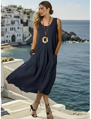 Dámské Midi šaty 100% Bawełna Úpletové šaty Letní šaty Volnočasové šaty Základní Klasické Na běžné nošení Denní Venkovní Běžný Čistá barva Bez rukávů Do U Vojenská zelená Námořnická modř Oranžov