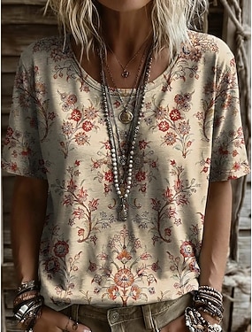 Dámské Tričko Tisk Květinový Grafika Geometrický Vinobraní stylové Na běžné nošení Krátký rukáv Tričkový Běžné topy Ležérní Denní Víkend Černá Světlá růžová Dusty modrá Hnědá Léto Jaro