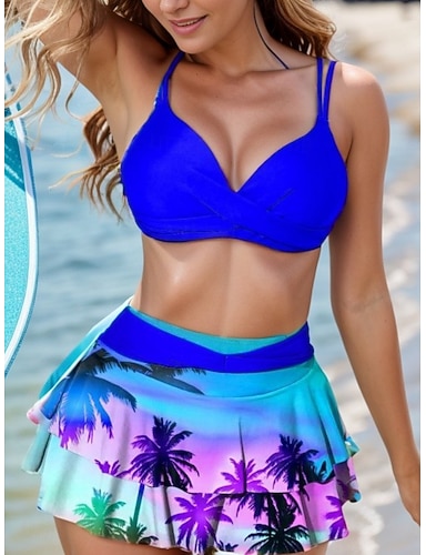 Dámský bikiny dvoudílný plavky s palmami sukně štíhlý bez zadního dílu na dovolenou plážové oblečení květinové listy výstřih do V bez rukávů