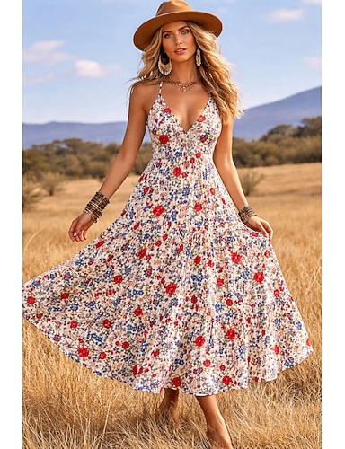 Dámské Maxi šaty Boho šaty Letní šaty Volnočasové šaty Etnické šaty Elegantní Čechy prázdniny Plážové Dovolená Rande Volný Květinový Grafika Bez rukávů Do V Černá Rubínově červená Oranžová Léto Jaro