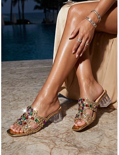 Dámské zlaté sandály na vysokém podpatku s kamínky, boty na párty s otevřenou špičkou a křišťálovým podpatkem pro noční život a kluby &okouzlující vzhled