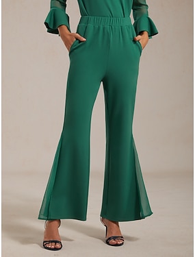 Dámské kalhoty, strečová tkanina, šifon, průsvitné panely, rozšířené nohavice, elastický pas, elegantní, pohodlné, do práce, podzim