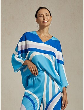 Dámský saténový svetr s volným střihem, výstřihem do V a modrým geometrickým potiskem