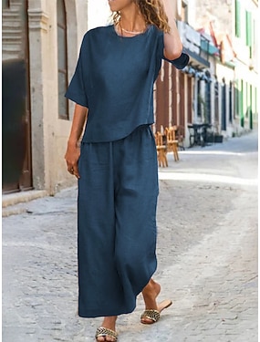 Dámská dvoudílná sada z umělé bavlny, jako by se jednalo o len, sety inspirované lnem, aktivní, bez rukávů, široké nohavice, kulatý výstřih, denní, domácí, volný střih, světle modrá, tmavě modrá,