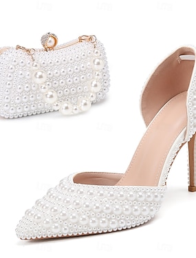 Dámské bílé perleťové jehlové podpatky a kabelka – elegantní špičaté boty na vysokém podpatku na svatbu, večírky a formální události