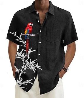 Pánské Ptáček Rostliny Papoušek Havajská košile Košile na knoflíky Aloha košile Krátký rukáv Havajské Dovolená Oblečení na pláž Léto Jaro Přehnutý 3D tisk Jedna přední kapsa Len jako košile Černá