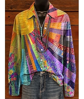 Dámská košile ze lnu jako prodyšná lehká grafická duhová elegantní Bohemia vintage dlouhý rukáv límec pravidelné topy pracovní každodenní potisk růžová purpurová oranžová jaro podzim zima