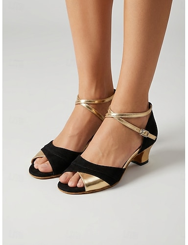 dámská černá &Zlaté boty na latinskoamerické tance, otevřená špička s kříženým páskem na nízkém podpatku, cvičební boty na salsu, tango, společenské tance &školení