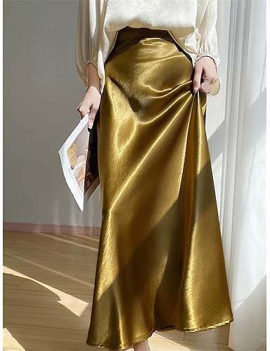 Dámské Saténové sukně Elegantní Vinobraní Módní Na běžné nošení Midi Vysoký pas Sukně Bez vzoru Nabírané šaty Slátanina Rozdělené konce Neelastické Denní kancelář a kariéra Černá Šampaňská Oranžov