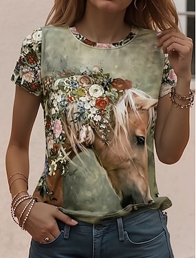 Dámské Tričko Tisk Grafika Zvíře Vinobraní stylové Klasické Krátký rukáv Tričkový Kulatý Běžné topy Denní Víkend Černá Bílá Trávová zelená Léto Jaro Podzim