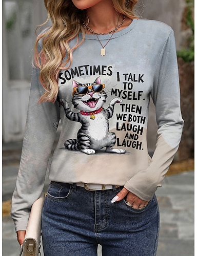 Ženské tričko s dlouhým rukávem grafika zvíře kočka vintage móda stylové dlouhý rukáv kulatý výstřih běžné topy denní víkendový potisk šedá jaro podzim předpodzim