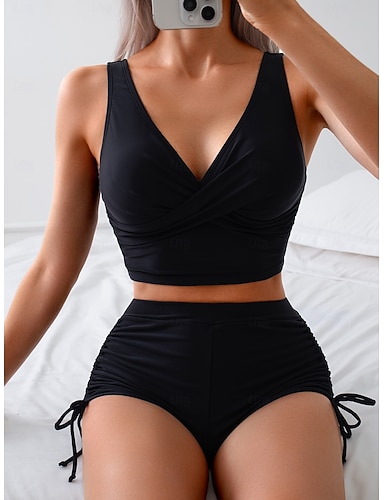 Ženské bikiny 2-dílné plavky řasené veselý styl kontrola břicha vysoký pas štíhlé bez zad na dovolenou plážové oblečení jednobarevné V-krk bez rukávů plavky