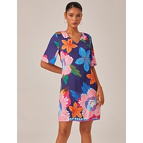 Dámské Šaty s potiskem Mini šaty Námořnická modř Poloviční rukáv Květiny Květinový styl Potisk Léto Do V Šaty XS S M