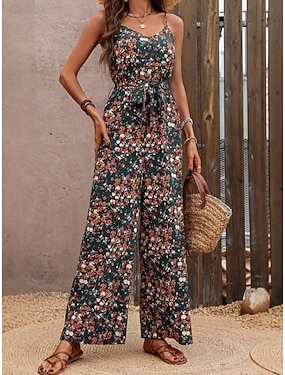 Dámské Běžný Kombinéza Aktivní Květinový Bez rukávů Široké nohavice Do V Kapsy Tisk Denní Plážové Volný Rubínově červená Léto