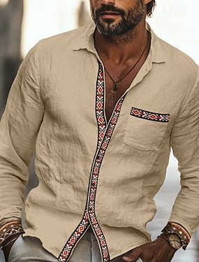 Pánské Košile Lněná košile Letní košile Plážová košile Košile na knoflíky retro košile Pevná barva Dovolená Denní nošení Khaki Dlouhý rukáv Přehnutý Léto Oblečení Slátanina