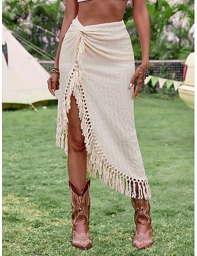 Dámské Dovolená sukně Čechy Na běžné nošení Midi Vysoký pas Sukně Bez vzoru Třásně Lehce elastické Denní ulice Meruňková Léto Polyester