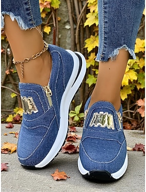 Dámské džínové nazouvací tenisky se zlatými detaily – lehké ležérní boty na chůzi s bočním zipem na nakupování, dojíždění do města i víkendové pobyty