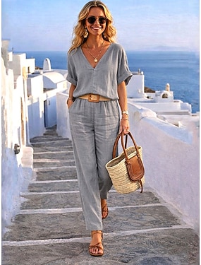 Dámské Sady kalhot Bolero Top Imitace bavlny a lnu Poloviční rukáv Do V Pevná barva Módní Šik ven Ležérní Denní Venkovní Šedá Léto Běžný