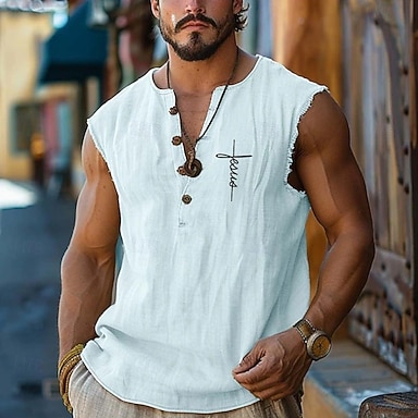 Pánské tílko s křížovým vzorem, vesta, top bez rukávů, tričko s dalšími potisky, tričko s hlubokým V, dovolená, denní, havajský, plážový, světle modrá, černá, bílá, jaro &letní oblečení