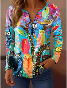 Dámské tričko dlouhý rukáv čtvrtzip dlouhý rukáv volnočasové grafika sova elegantní vintage stylové V-výstřih pravidelné topy každodenní růžová modrá oranžová zelená jaro podzim předpodzim