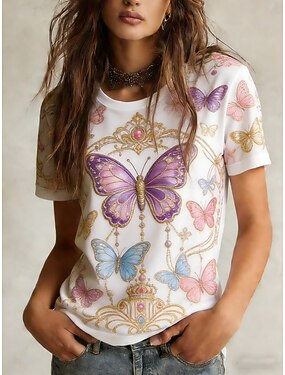 Dámské Tričko Tričko Top Tisk Grafika Motýl stylové Klasické Na běžné nošení Krátký rukáv Tričkový Běžné topy Denní Jdeme ven Víkend Fialová Léto Jaro