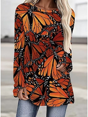 Dámské Tričko Tisk Grafika Zvíře Motýl Vinobraní stylové Klasické Dlouhý rukáv Tričkový Kulatý Běžné topy Denní Černá Oranžová Jaro Podzim
