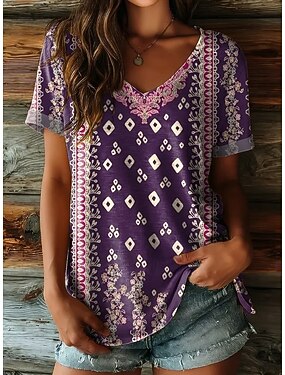 dámské boho tričko květinový grafický vintage stylové klasické krátký rukáv V krk dlouhé topy denní víkendové oblečení potisk modrá fialová fuchsiová zelená léto jaro