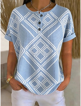Dámské Tričko Tisk Knoflíky na hrudi Geometrický stylové Klasické Moderní Krátký rukáv Henley Běžné topy Denní Vodní modrá Léto Jaro