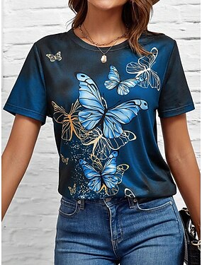Dámské Tričko Tisk Motýl Na běžné nošení Krátký rukáv Kulatý Běžné topy Denní Vodní modrá Léto