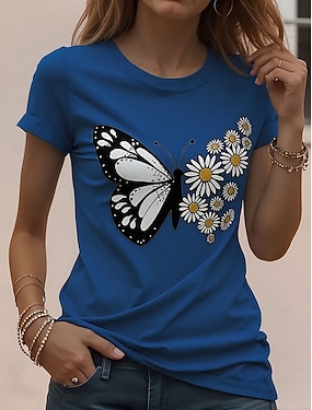 Dámské Tričko Tisk Grafika Zvíře Vinobraní stylové Klasické Krátký rukáv Tričkový Kulatý Běžné topy Denní Víkend Vodní modrá Bílá v modrá Nebeská modř Léto Jaro Podzim