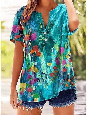 Dámské Tričko Květinový Grafika Rostliny stylové Klasické Krátký rukáv Do V Běžné topy Ležérní Denní Vodní modrá Černá Bílá Oranžová Léto Jaro