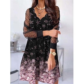 dámské ležérní šaty květinová síťovina patchwork vroubkovaný výstřih mini šaty dovolená s dlouhým rukávem léto