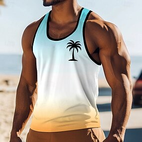 Pánské minimalistické tropické oblečení s motivem palmy, pláž, ombré, modrá, bílá, žlutá, tílko, vesta, bez rukávů, tričko s výstřihem do U, léto, pláž, dovolená, surfování, ležérní oblečení, velikost