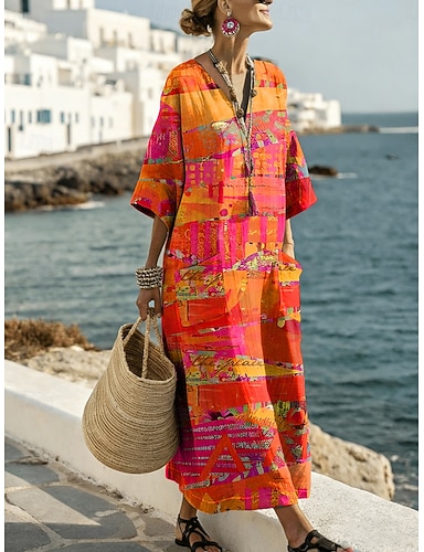 Maxi šaty pro ženy len prodyšné lehké sluneční šaty A-linie dovolená volnočasové boho plážové vycházkové květinové geometrické dlouhý rukáv V-výstřih modré bílé světle fialové oranžové léto jaro
