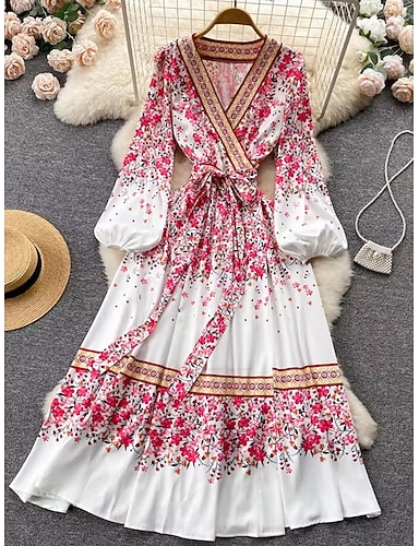 Dámské Midi šaty Áčkové šaty prázdniny Na běžné nošení Cikánský Denní Večerní oslava Párty Běžný Květinový Grafika Dlouhý rukáv Do V Světlá růžová Léto Jaro