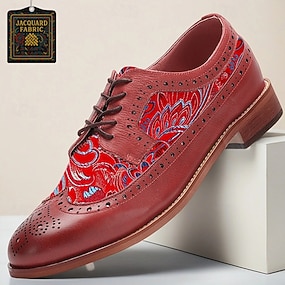 Pánské červené kožené brogue boty s květinovým vzorem z žakárové tkaniny - stylové a elegantní, ideální pro módně orientované gentlemany na poloformální a zvláštní příležitosti.