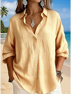 Dámská bavlněná lněná košile nabírané knoflíky jednobarevná jednobarevná stylová volnočasová dlouhý rukáv límec pravidelné topy denní bílá žlutá růžová zelená léto jaro