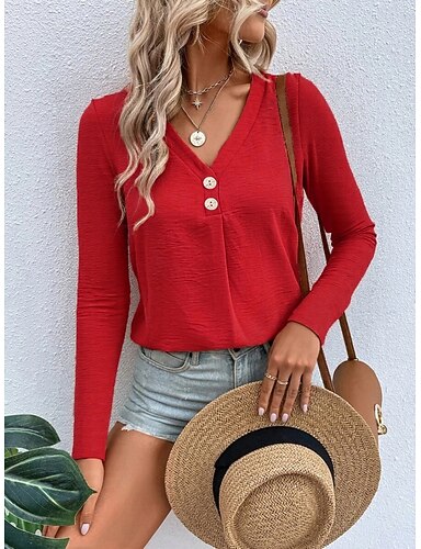 Dámské Halenka Pevná barva stylové Na běžné nošení Dlouhý rukáv Do V Běžné topy Denní Knoflíky Rubínově červená Oranžová Hnědá Léto Jaro Podzim