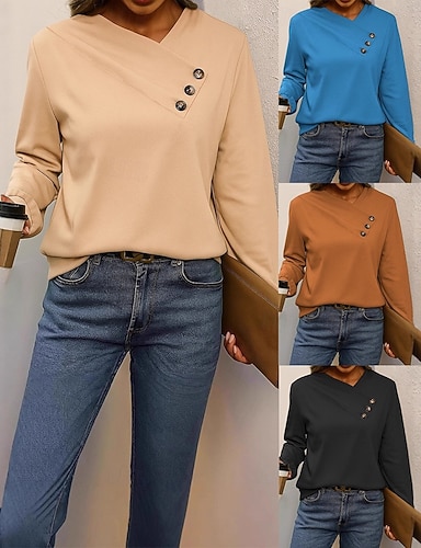 dámské vycházkové topy stylové základní jednobarevné knoflíky asymetrické dlouhé rukávy běžné topy posádkový výstřih denní zaprášená růže jaro podzim zima
