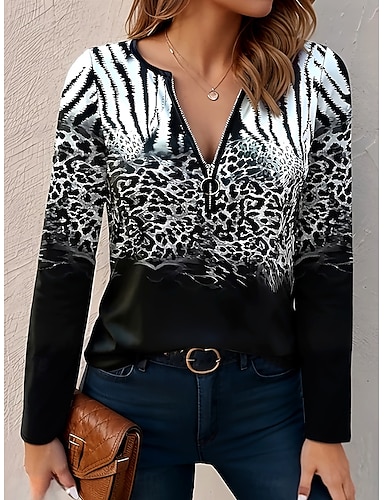 Dámské Tričko Tónované Grafika Leopard Elegantní Vinobraní stylové Dlouhý rukáv Do V Kulatý Vroubkovaný krk Běžné topy Denní Víkend Zip Tisk Černá Jaro Podzim Zima