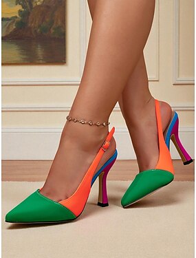 Dámské barevně blokové jehlové podpatky s páskem na zádech - zářivé špičaté lodičky na párty, módní akce a odvážné streetwear outfity