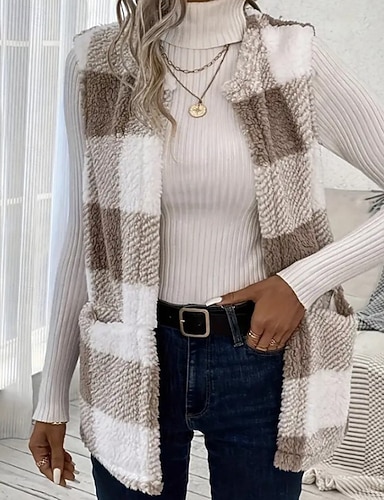 Dámské Kamizelka Shearling vesta Pohodlné Kapsy Knoflíky Na běžné nošení Pléd Dovolená Denní nošení Jdeme ven Víkend Standardní Výstřih ke krku Běžný Bez rukávů Svrchní oděvy Černá Khaki Světle šedá