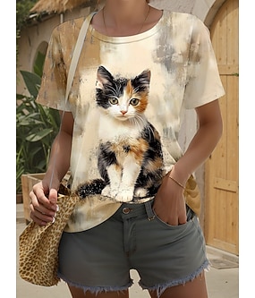 Dámské Tričko Tisk Grafika Zvíře Kočka stylové Klasické Moderní Krátký rukáv Tričkový Kulatý Běžné topy Denní Jdeme ven Víkend Světle hnědá Léto Jaro