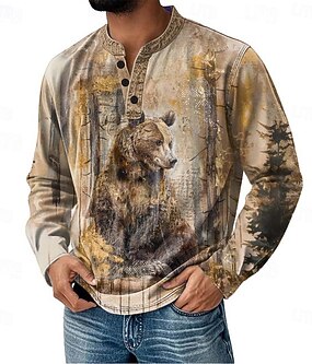Pánské Grafika Zvíře Tričko Henley Dlouhý rukáv Módní Denní Retro Ležérní Dovolená Jdeme ven Podzim zima Podzim Jaro & podzim Modrá Fialová Khaki Šedá Henley Tričko Henley
