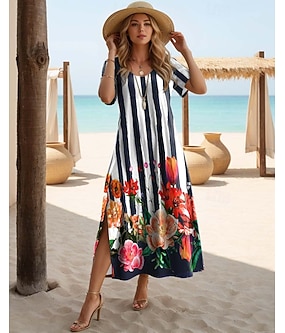 Dámské maxi šaty casual šaty tričkové šaty tee šaty plážové šaty boho schůzka pravidelný střih geometrické krátký rukáv kulatý výstřih černá bílá růžová fialová léto