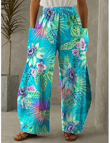 Dámské Imitace bavlny a lnu Široké nohavice Kalhoty pro volný čas Letní kalhoty prázdniny Módní Šik ven Plná délka Středně vysoký pas Květinový Grafika Kapsy Elastický pas Tisk Pohodlný Pohodln