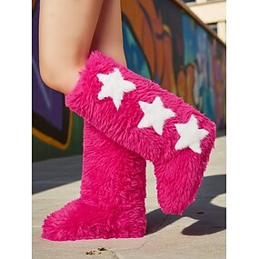 Dámské růžové chlupaté boty s hvězdami - plyšové boty Y2K kawaii ke kolenům pro kpop streetwear, outfity na hudební festivaly a outfity na TikTok